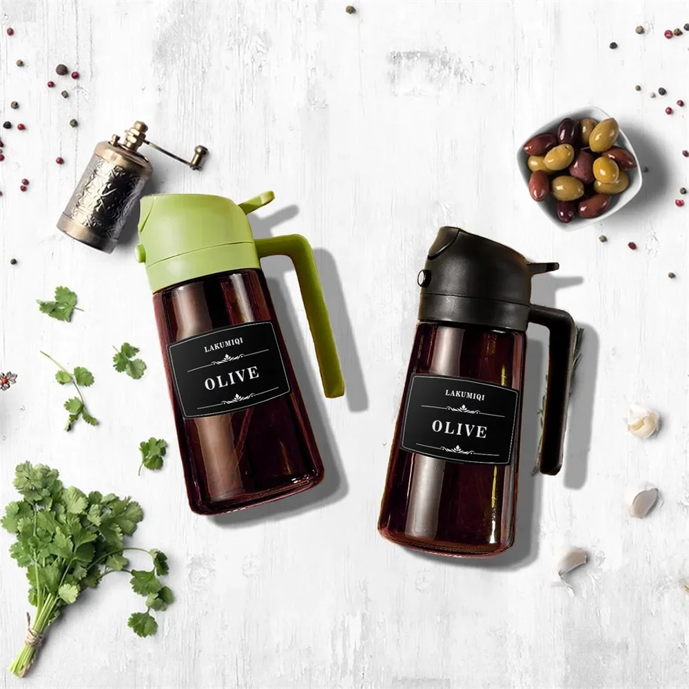 Easy TO USE: This two in one olive oil spray with a buckle design is very easy to use. Pouring oil: Open the buckle and gently pour it out, and the oil will flow smoothly from the pouring port. Spray: press the spray button towards the food (after the first use, press several times to empty the air in the silica gel catheter, the oil will enter the catheter, and then spray out), salad, steak, barbecue will enjoy an olive oil bath.